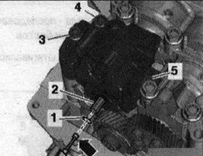 Снять стопорное кольцо «1» посредством клещей для стопорных колец. Извлечь приводной вал «2» с помощью электромагнита «стрелка» из масляного насоса. Выкрутить болты «3,4,5» и снять масляный насос. Болт промежуточного зубчатого колеса ослаблять запрещается.