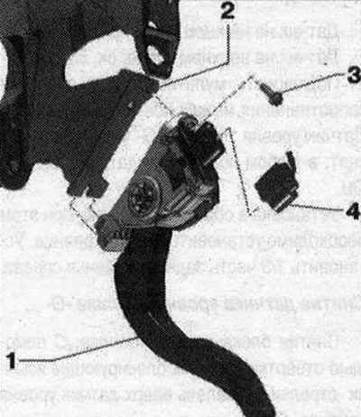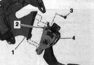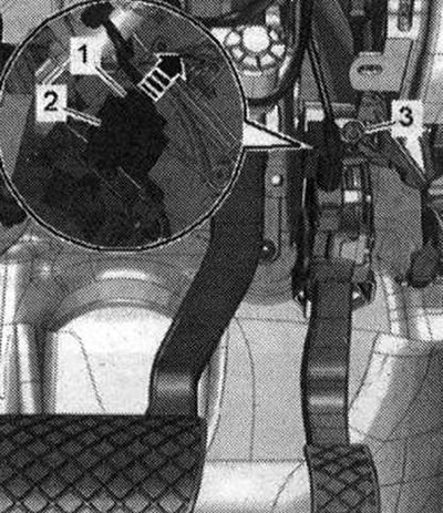 Снять нижнюю облицовку панели приборов со стороны водителя. Отсоединить штекерный разъем «2», нажав на фиксатор «1» вверх «стрелка». Выкрутить болт «3» и снять модуль педали газа по направлению вниз.