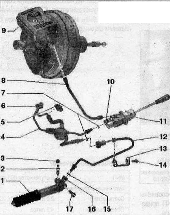 Гидравлическая система сцепления 1. Рабочий цилиндр сцепления: после снятия педали сцепления не приводить в действие; после работ на гидравлическом приводе сцепления прокачать привод сцепления; попадание торм. жидкости на КП не допускается; 2. Воздухоотводный винт: 5,5 Н·м; соблюдать порядок действий при прокачке; сломанный штуцер прокачки можно вывернуть ключом с внутренним шестигранником (3 мм); 3. Защитный колпачок; 4. Трубо-шланговая магистраль: с частотным модулятором; штуцерных разъемов на главном и рабочем цилиндрах; 5. Удерживающий зажим; 6. Насадка; 7. Уплотн. кольца круглого сечения: при повреждении заменить; устанавливать, смочив торм. жидкостью; 8. Подающий шланг главного цилиндра сцепления: с встроенными уплотнительными насадками; при поврежденных уплотнительных насадках заменить питательный шланг; 9. Бачок с торм. жидкостью; 10. Стопорный зажим: для снятия и установки трубо-шланговой магистрали вытянуть до упора; 11. Главный цилиндр сцепления: после работ на гидравлическом приводе сцепления прокачать привод сцепления; 12. Трубопровод; 13. Кронштейн: для трубопровода; крепится на КП; 14. Болт: 20 Н·м; 15. Уплотн. кольцо: при повреждении заменить; устанавливать, смочив торм. жидкостью; 16. Стопорный зажим: для снятия и установки трубо-шланговой магистрали вытянуть до упора; 17. Болт: 20 Н·м
