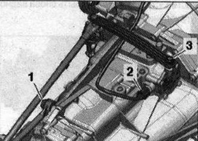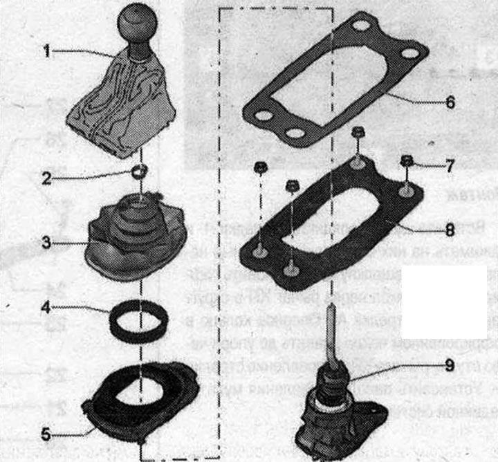 Рукоятка с кожухом рычага КП 1. Кнопка переключениях манжетой рычага КП; 2. Хомут: крепит ручку переключения на рычаге переключения передач; закреплять с помощью зажима шланговых хомутов V.A.G 1275-; 3. Гофрированный чехол (пыльник): предоставляется только в сборе с опорным кольцом; снимать и устанавливать вместе с шумоизоляцией; 4. Опорное кольцо: предоставляется только в сборе с гофрированным кожухом; 5. Шумоизоляция; 6. Прокладка; 7. Гайка: 8 Н·м; 8. Опорное крепление: для втулки рычага переключения; 9. Рычаг переключения передач со втулками рычага