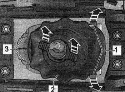 Разблокировать стопорные накладки «1» в «направлении стрелки». При этом приподнять заднюю шумоизоляцию. Извлечь шумоизоляционный экран из креплений «3». Снять гофрированный чехол «2» с рычага КП «в направлении стрелки».
