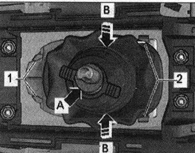 Вставить шумоизоляцию в накладки «1» и нажимать на них вниз, пока стопорные накладки «2» не защелкнутся. Установить гофрированный чехол через рычаг КП в скругленный паз «стрелка А». Опорное кольцо в гофрированном чехле вдавить до упора через втулку рычага КП -направление стрелки В-. Установить панель управления мультимедийной системы «Е380».