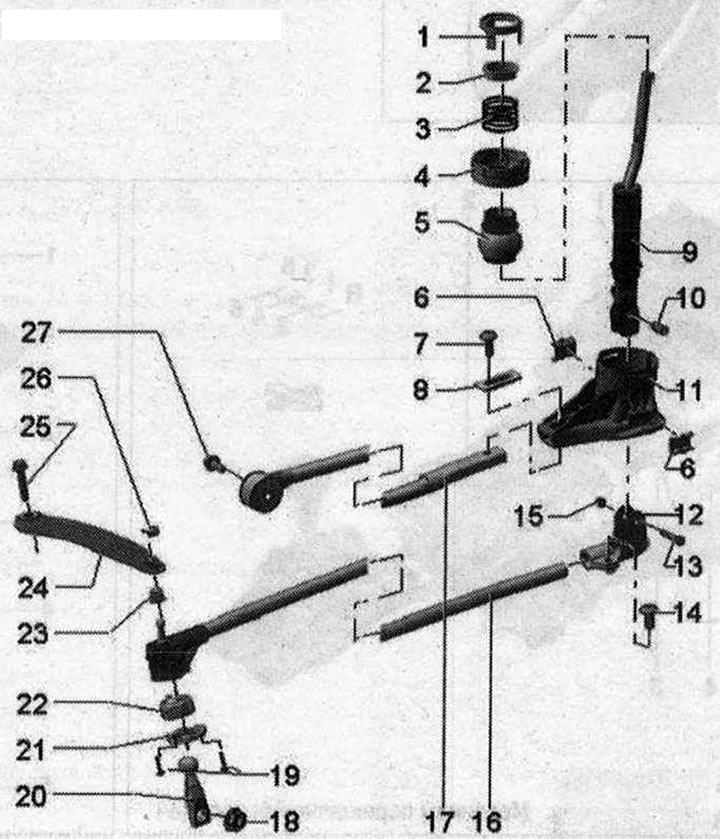 Механизм переключения передач 1. Стопорное кольцо: для снятия извлечь шарик; 2. Распорная втулка; 3. Прижимная пружина; 4. Шариковая направляющая: не смазывать; 5. Шарик: не смазывать; 6. Звукоизоляция: втулки рычага переключения; не смазывать; 7/14. Болт: 23 Н·м; 8. Зажимная плита: не смазывать; 9. Селектор: изгиб обращен назад; при необходимости, смазать погружную нажимную направляющую и упоры рычага переключения; 10. Дистанционная трубка; 11. Подшипник рычага переключения: не смазывать; 12. Элемент шарнира: между тягой и рычагом переключения; при необходимости, смазать; 13. Болт: для шарнира; 15. Гайка: 10 Н·м; 16. Шток переключения; 17. Штанга толкателя: с болтом и подкладной шайбой; 18. Гайка: 20 Н·м; заменить; 19. Болт: 4 Н·м; 20. Рычаг переключения передач: установить таким образом, чтобы совпадали шлицы на валу переключения; при необходимости, смазать; 21. Уплотнительная манжета; 22. Шаровая опора: при необходимости, смазать; 23. Опорная втулка: для снятия извлечь защитную скобу; 24. Соединительная тяга: для снятия извлечь защитную скобу; 25/27. Болт: 20 Н·м; 26. Стопорный зажим