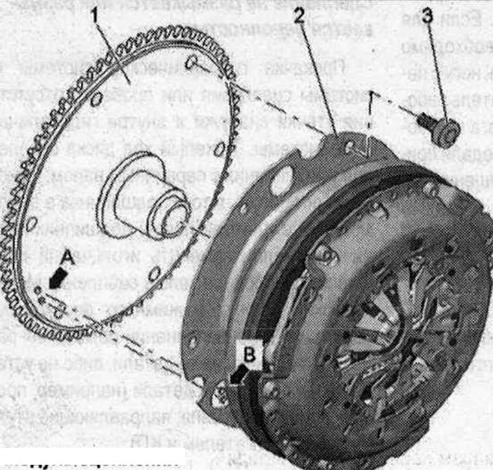 Модуль сцепления А. Фиксирующий палец: имеется не на всех а/м; при соединении модуля сцепления «2» с ведомым диском «1» фиксирующий палец «А» (при наличии) должен войти в отверстие «В»; В. Фиксирующее отверстие: при соединении модуля сцепления «2» с ведомым диском «1» фиксирующий палец «А» (при наличии) должен войти в отверстие «В»; 1. Ведомый диск: в 4-цилиндровых двигателях - 3 отверстия с резьбовыми втулками; в 6-цилиндровых двигателях - 6 отверстий с резьбовыми втулками; с игольчатым подшипником; 2. Модуль сцепления: с пластиной; компоненты: двухмассовый маховик, диск сцепления и корзина сцепления; 3. Болт: 60 Н·м; для крепления двухмассового маховика на ведомом диске; 3 шт. в а/м с 4-цилиндровым двигателем; 6 шт. в а/м с 6-цилиндровым двигателем; всегда подлежит замене; соблюдать последовательность затяжки
