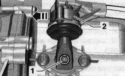 Затянуть болты кольцевым ключом 16 мм -V.A.G 1332/14 «. 6» ю передачу включить, для этого извлечь вал переключения «1» и переключить рычаг КП «2» вперед в «направлении стрелки».