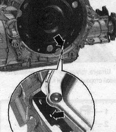 Следующий этап работы обязательно необходим для обеспечения равномерного прилегания к ведомому диску без перекоса. Вращать оба передних колеса в одном направлении так, чтобы модуль сцепления совершил 1 полный оборот. Контрольное отверстие «стрелка» должно быть снова видно в углублении корпуса КП.