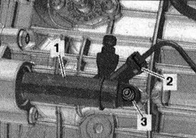 Для снятия стопорной скобы «2» необходимо разблокировать ее отверткой и вытянуть до упора. Снять шланговую магистраль с рабочего цилиндра сцепления и заткнуть ее. Вывернуть болт «3», извлечь рабочий цилиндр сцепления «1» назад. Во избежание загрязнения открытых магистралей закрыть их и штуцеры чистыми заглушками из набора заглушек для двигателя «VAS 6122».