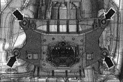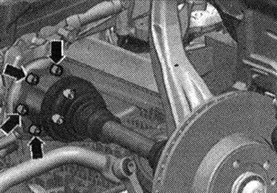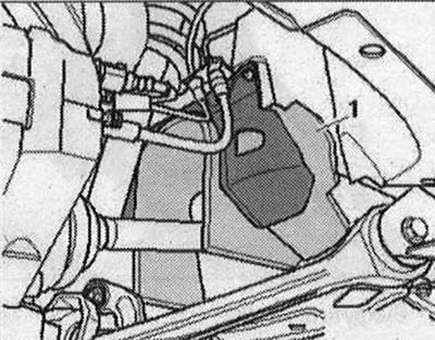 Выкрутить болты «стрелки» и снять теплоизоляционный щиток правого приводного вала.