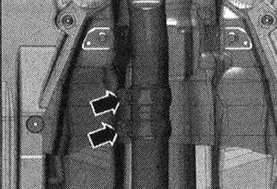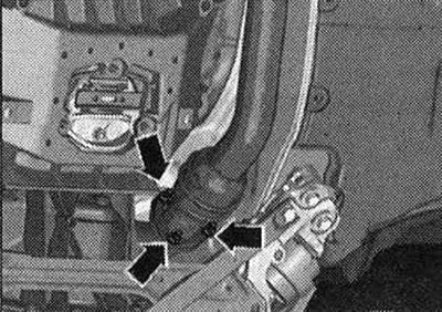 Опасность повреждения витой пружины Airbag. Отсоединять карданный шарнир от рулевого механизма только при установленных прямо передних колесах. Больше не изменять положение рулевого колеса и рулевого механизма, для этого, при необходимости, зафиксировать рулевое колесо клейкой лентой. Выкрутить болт «стрелка» карданного шарнира. Отжать карданный шарнир рулевого механизма и полностью сдвинуть вверх.