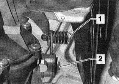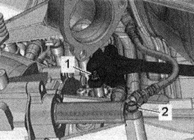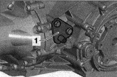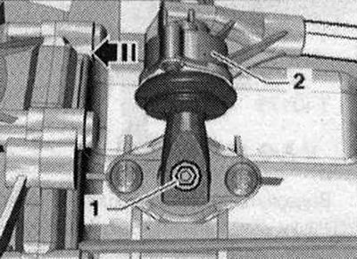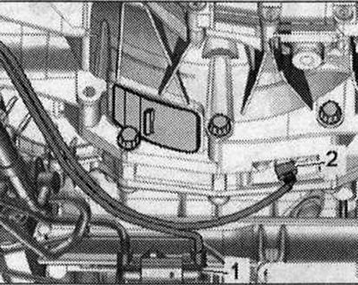 Выкрутить винт «2» и снять с КП рабочий цилиндр сцепления, выведя при этом трубку из кронштейна. Подвязать рабочий цилиндр сбоку от двигателя. Опасность повреждения рабочего цилиндра сцепления. На педаль сцепления после демонтажа рабочего цилиндра сцепления не нажимать. Выкрутить гайку «1».
