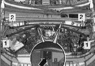 Отвернуть болт «1» и «2» и снять крепежную скобу.