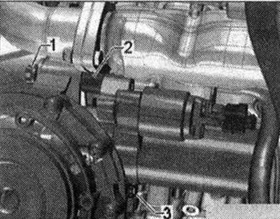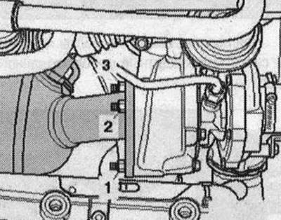 Снять корпус возд. фильтра. Выкрутить гайки «1,2,3» турбонагнетателя и подвязать фильтр.