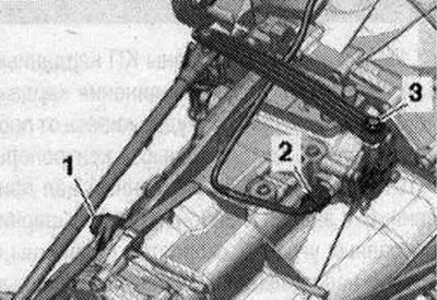 Выкрутить гайку «1» напорной гидравлической масляной магистрали гидроусилителя руля. Опасность повреждения деталей ходовой части. Если подрамник, рулевой механизм или распорная крестовина подрамника не установлены надлежащим образом, а/м нельзя ставить на колеса! Использование подрамника или крестовины подрамника в качестве опоры а/м (например, при поднятии домкратом или подобным приспособлением) недопустимо! Отвернуть болты «стрелки» и снять распорную крестовину подрамника.