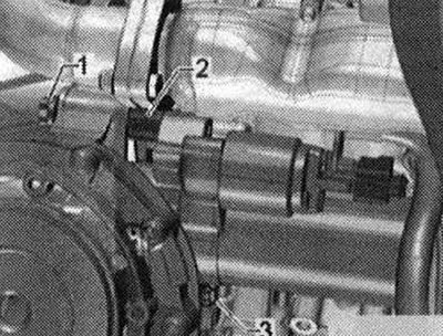 Выкрутить болт «3» стартера со стороны двигателя. Снять стартер с КП и оставить в монтажном положении. Отсоединять кабели стартера не требуется.