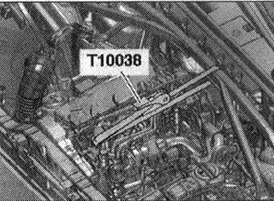 Установить растяжку и подвесить с помощью ремня «Т10038» на проушине двигателя, как показано на рис. Натянуть стяжной ремень.