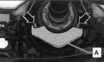 При наличии выкрутить болты «стрелки» и снять теплозащитный щиток карданного вала «А».