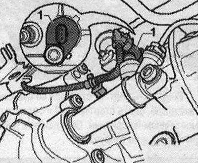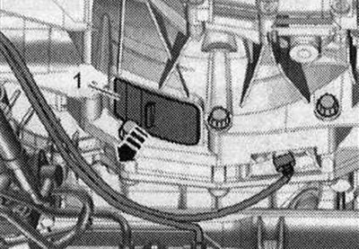 Отсоединить разъем «2» датчика частоты вращения двигателя «G28» и высвободить эл. провод из креплений. «Поз. 1» не учитывать.