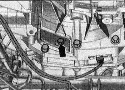 Вывернуть оставшиеся болты «7...9» соединения двигатель/КП. Выкрутить болты «стрелки» поперечины тоннеля. Отжать КП от двигателя и осторожно опустить ее при помощи кантователя. При опускании проверить, что на верхней стороне КП не защемлен кабель. При опускании следить за свободным ходом приводных валов.