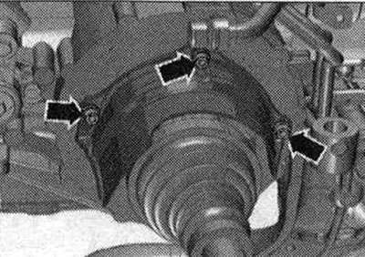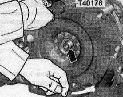 Выкрутить 3 болта «стрелка» ведомого диска, для этого проворачивать модуль сцепления соответственно через 120° в направлении вращения двигателя.