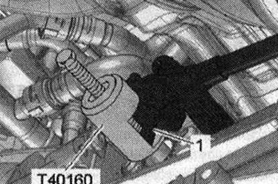 Опасность повреждения вала переключения в КП. Не отжимать рычаг переключения «1» монтировкой и не сбивать молотком. Рычаг переключени КП снимать только при помощи съемника «Т40160». Установить съемник «Т40160» и снять рычаг переключения «1».