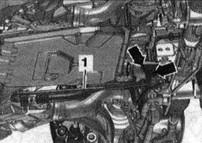 В случае замены снятой КП необходимо переставить следующие детали на новую КП. Держатель «1» крепежной планки системы выпуска ОГ.
