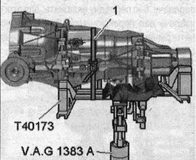 Установить подъемник для двигателя и КП с креплением КП «Т40173» под КП и зафиксировать натяжным ремнем «1», как показано на рисунке.