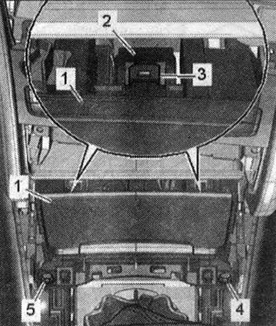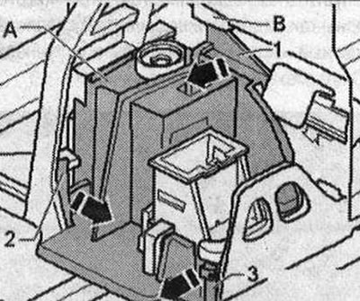 Установка в обратном порядке. Повернуть шаровую головку «1» в правильное монтажное положение. Ввести электромагнит блокировки селектора «N110» сверху под наклоном в механизм переключения передач и отклонить снизу в обратном «направлении стрелки». Шаровая головка «1» должна полностью войти в рычаг управления механизма переключения передач; при необходимости, на нее можно нажать небольшой отверткой. Закрепить магнит блокировки селектора АКП «N110» в фиксаторе «А». Насадить крышку «А» на магнит блокировки селектора АКП «N110» и осторожно закрепить «1...3». Подключить штекерные разъемы. Перед оставшейся сборкой проверить работу механизма переключения передач. Установить переднюю пепельницу.