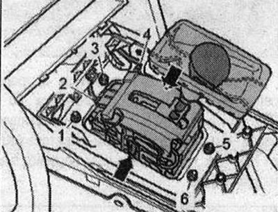 Выкрутить гайки «1,3,5,6» на несколько оборотов, не выкручивать полностью. Тем самым функциональный блок механизма переключения передач немного опустится, что создаст больше удобств для дальнейшего демонтажа. Опасность повреждения механизма переключения передач по причине сломанных крепежных скоб, выступов или других деталей. Обратить внимание на то, чтобы никакие детали или предметы не оказались внутри механизма переключения передач. Если это произошло, заменить механизм переключения передач.