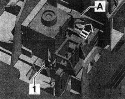 Отсоединить штекерный разъем от магнита блокировки селектора АКП «N110». Нажать фиксаторы «А» в направлении «стрелки» и удерживать в этом положении. Если защелка «А» сломана, необходимо заменить функциональный блок механизма переключения передач.