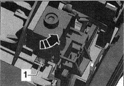 Наклонить магнит блокировки селектора АКП «N110» «в направлении стрелки» так, чтобы шаровая головка «1» вышла из рычага управления механизма переключения передач. Снять магнит блокировки селектора АКП «N110».