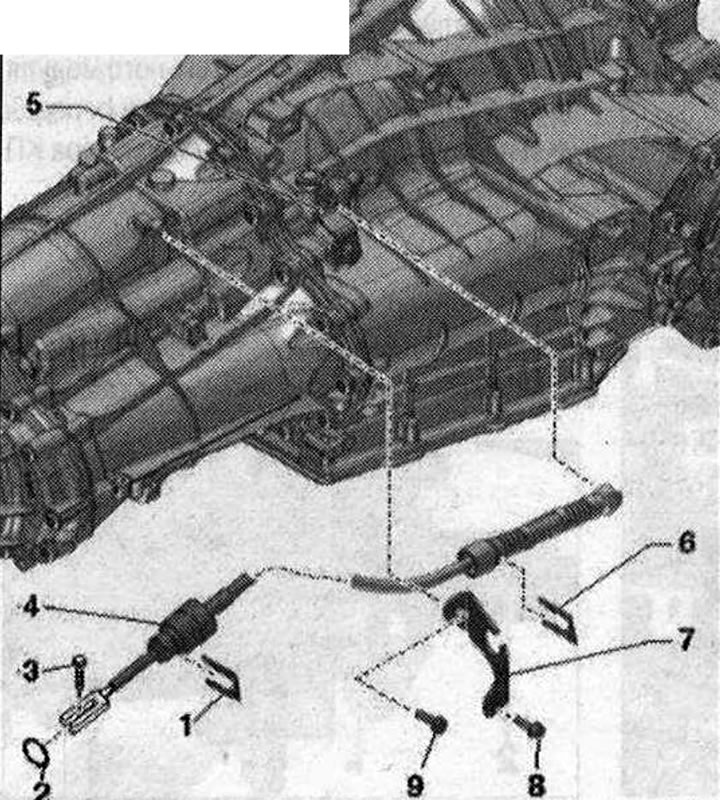Трос рычага селектора 1. Стопорный зажим троса селектора на функциональном блоке привода переключения; 2. Уплотн. кольцо: заменить; 3. Болт: для регулировки троса селектора; крепление на функциональном блоке механизма переключения передач;13 Н·м; 4. Трос селектора КП: не сгибать и не перегибать; различные исполнения в зависимости от а/м; при поврежденной резиновой; втулке заменить трос селектора; перед установкой слегка смазать шаровой подпятник Смазкой из полимочевины «G 052 142 А2»; установить резиновую манжету со стороны КП без перекосов; 5. Рычаг переключения передач; 6. Стопорный зажим: тросовой тяги селектора к опоре троса; 7. Упор троса; 8/9. Болт: 8 Н·м