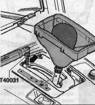 Потянуть рычаг стояночного тормоза, чтобы включить электромеханический стояночный тормоз. Переключить селектор АКП в положение "D". Осторожно отжать сбоку манжету рычага селектора с помощью клина «3409» «стрелки» и завернуть её вверх. Через отверстие «стрелка» в механизме переключения передач при помощи торцовой насадки «Т40031» на 1 оборот ослабить болт троса селектора АКП. Зажимной болт только ослабить - не выкручивать. Доступ к зажимному болту свободен только в положении С ослабленным зажимным болтом селектор АКП должен оставаться в положении "D".