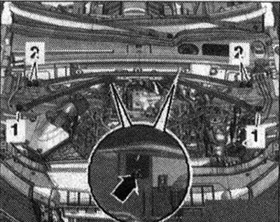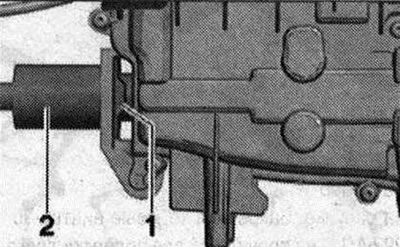 Снять стопорную скобу «1» сбоку троса селектора АКП. Извлечь трос селектора «2» из механизма переключения передач.