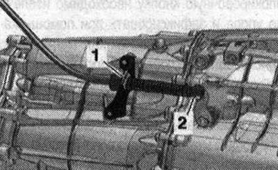 Открепить шаровой подпятник «2» троса селектора АКП отжимным рычагом «80-200» от рычага КП. Снять фиксирующую скобу «1» и отсоединить трос селектора АКП от КП. Трос селектора нельзя перегибать и надламывать.