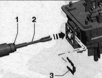 Установка в обратном порядке. Заменить уплотн. кольцо троса селектора АКП. Заменить стопорные шайбы шумоизоляции. Перед монтажом слегка смазать петлю и шаровой подпятник троса селектора АКП Поликарбамидной смазкой «G 052 142 А2». Вставить уплотн. кольцо «1» троса селектора АКП. Ввести трос селектора АКП «2» в функциональный блок механизма переключения передач «стрелка». Закрепить трос селектора передач «2» стопорной скобой «3».