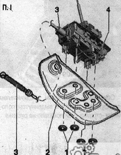 При наличии снять стопорные шайбы «1» на шумоглушителе «2». Снять шумоизолирующий экран «2» с исполнительного модуля привода механизма переключения передач «4» и переместить над тросом селектора КП «3» по направлению вперед.