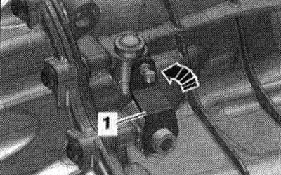 В этом положении осторожно насадить шаровой подпятник троса селектора «2» на рычаг КП. При нажатии не деформировать рычаг переключением передач, так как в этом случае становится невозможной точная регулировка переключателя. Зафиксировать трос селектора АКП стопорным зажимом «1». Отрегулировать трос селектора КП. Установить систему выпуска ОГ и закрепить без механических напряжений. Установить распорку стоек.