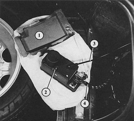 Падвойная нагнятальная помпа (2) цэнтральнага замка ўсталяваны пад правай абліцоўваннем багажніка. Тут ён "вынуць" са сваёй абалонкі з пенапласту (1). Далей вы бачыце: электрычныя правады (4) і нагнятальны/вакуумны шланг (3) да пераключалых элементаў.
