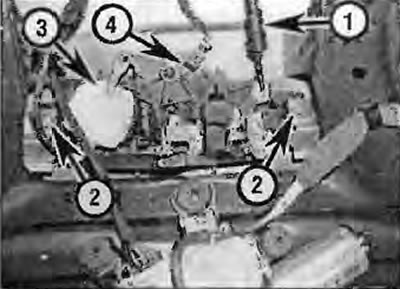 Мал. 16.1, б. Цыліндр замка (Avant): 1. Шток кіравання 2. Гайкі мацавання 3. Вакуумны акцюатар 4. Выключальнік цэнтральнага замка |
