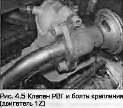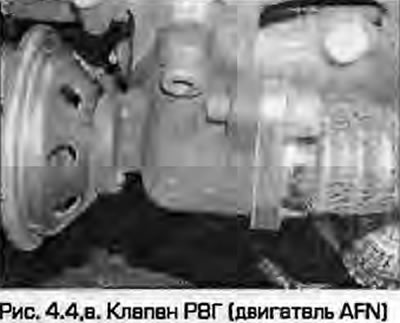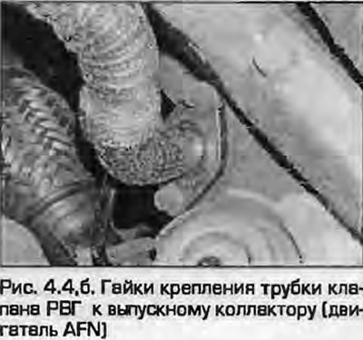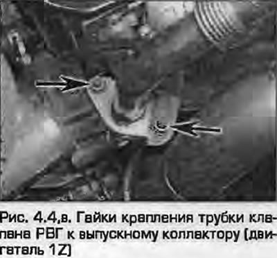 4. Адкруціце гайкі і ніты і адлучыце паўгнуткую злучальную трубку ад фланца клапана са боку выпускнога калектара. Трубка далучана да впускнога калектара двума гайкамі, да клапана РВГ - двума нітамі (мал. 4.4, а-у). Зніміце пракладкі.