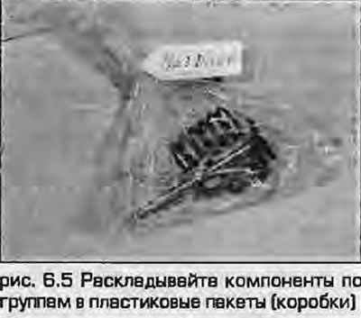 5. Вельмі важна пры зняцці складаць кампаненты па групах і трымаць іх разам, каб палегчыць усталёўку. Калі іх усталёўваць не на свае месцы, магчымы падвышаны знос. Раскладвайце групы кампанентаў па пластыкавых пакетах - пазначайце кантэйнеры, напрыклад: №1 выпускны, №2 впускной і г.д. (мал. 6.5). Цыліндр №1 знаходзіцца з боку рамяня ГРМ.