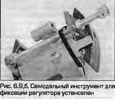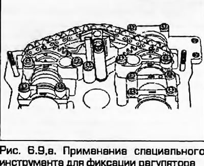 9. Аўтаматычны рэгулятар фазы распредвала перад здыманнем трэба заблакаваць. Механікі Audi выкарыстоўваюць для гэтага адмысловую прыладу 3366 (мал. 6.9, а). Можна вырабіць аналагічную самаробную прыладу з разьбовай шпількі, гайкі і маленькай металічнай пласціны, каб сціснуць рэгулятар. Для страхоўкі падвяжыце самаробную прыладу пластыкавым хамутом (мал. 6.9, бы, у).