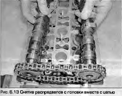 13. Паступова прыслабце балты мацавання накрывак 4 і 2 на абодвух распредвалах, зніміце абодва распредвала з галоўкі цыліндраў разам з аўтаматычным нацягвальнікам ланцугом (мал. 6.13).