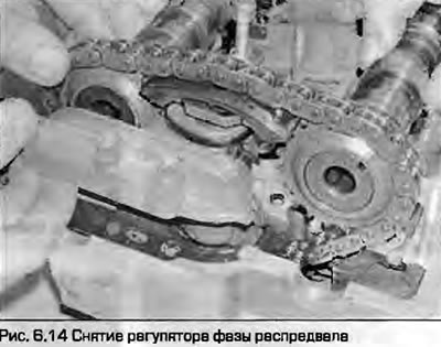 14. Адчэпіце рэгулятар ад ланцуга і зніміце ланцуг са зорачак распредвалов. Зніміце сальнікі з распредвалов (мал. 6.14).