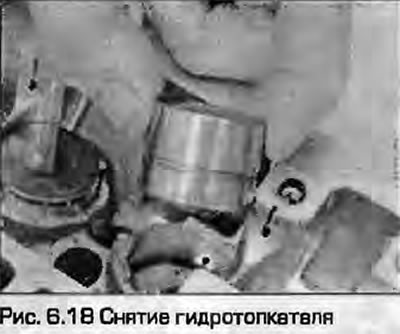 18. Зніміце гидротолкатели і раскладзяце іх донца ўніз, каб не выцекла алей (мал. 6.18). Рэкамендуецца захоўваць штурхачы, пагружанымі ў алей на ўвесь час рамонту галоўкі. Запомніце ўсталёўку кожнага штурхача, каб усталяваць іх пры зборцы на свае месцы ў пазбяганне падвышанага зносу.