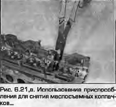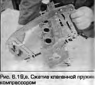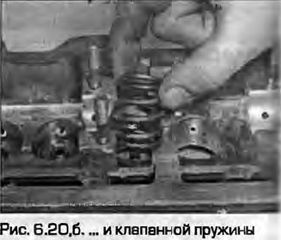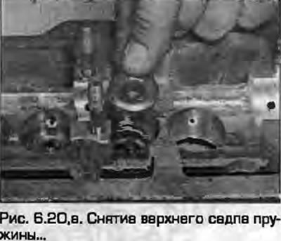 20. Вызваліце кампрэсар і зніміце сядло спружыны, затамкавую спружыну (бензінавыя рухавікі) ці здвоеную затамкавую спружыну (дызельныя рухавікі) (мал. 6.20, а, б).