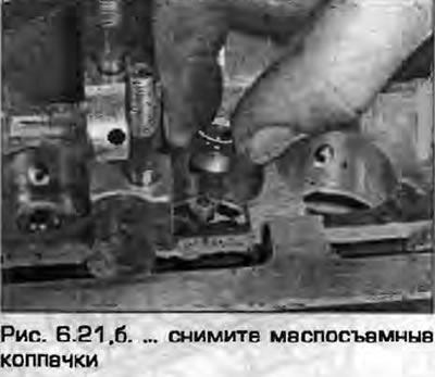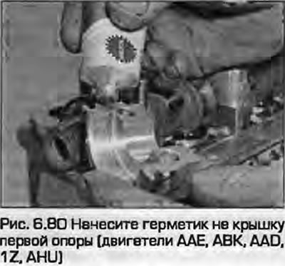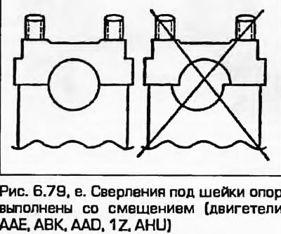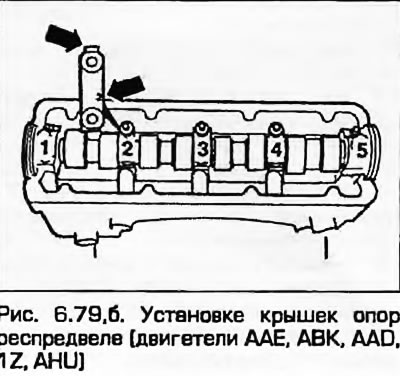 79. Вечкі апор пранумараваны і маюць стыкоўны выступ з аднаго боку. Калі вечкі ўсталяваць правільна, нумары на вечках павінны быць чытэльныя з выпускнога боку галоўкі цыліндраў і выступы павінны быць са впускной боку галоўкі цыліндраў. Вышмаруйце верхнія паверхні апорных шыек распредвала, амбасадара чаго ўсталюеце вечкі №2 і №4. Пераканайцеся ў іх правільнай усталёўцы і паступова зацягніце ніты мацавання загаданым момантам (мал. 6.79, а, б).