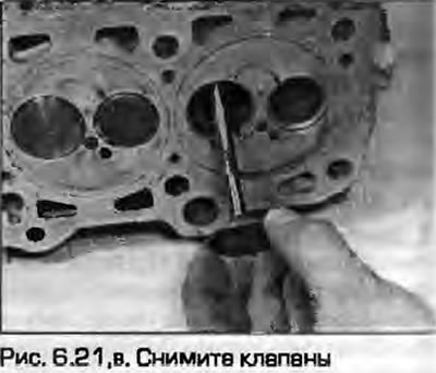 21. Пасатыжамі або спецыяльным здымнікам (зручны цангавы) сцягніце каўпачкі з накіроўвалых утулак, пасля чаго (на дызельных рухавіках) зніміце ніжняе сядло спружыны. Зніміце сам клапан са боку затамкавага сядла. Паўторыце працэдуру з астатнімі клапанамі (мал. 6.21, а-у).