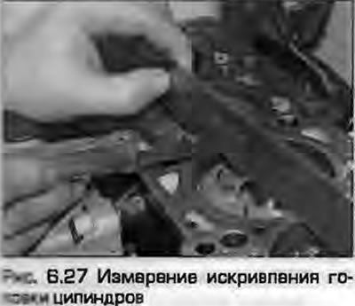 27. З дапамогай сталёвай лінейкі і набору плоскіх мацаў абследуйце галоўку на адсутнасць крывулі паверхні раздыма з блокам у некалькіх месцах (мал. 6.27). Параўнайце атрыманыя вымярэнні з дадзенымі, прыведзенымі ў Спецыфікацыях. На бензінавых рухавіках пры неабходнасці галоўку можна шліфаваць, не выходзячы за межы вышыні, указанай у Спецыфікацыях.