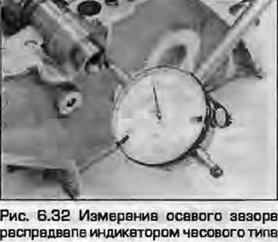 32. Каб вымераць восевы зазор распредвала, усталюеце распредвал у галоўку цыліндраў, усталюеце першую і апошнюю вечкі апор, зацягніце гайкі іх мацавання загаданым момантам для першай стадыі. Упрыце ножку індыкатара гадзіннікавага тыпу ў тарэц вала са боку рамяня ГРМ, замацаваўшы прыбор на галоўцы. Перамесціце распредвал да ўпора ў адзін канец і абнуліце шкалу. Зараз перамесціце распредвал да ўпора ў іншы канец галоўкі і зніміце сведчанні індыкатара. Перамясціце вал зноў да ўпора і пераканаецеся ва ўсталёўцы лімба на нуль (мал. 6.32).
